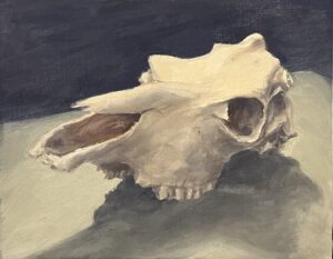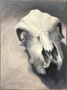 One nice thing about studying with the same teacher for years: you can do the same exercise over and over and end up with new variations. The first cow skull painting I ever did is still hanging in my dining room. My husband finds it amusing that, apparently, the cow is screaming at us. The second one looks rough, dark and cold. In the third iteration, I think the skull looks almost friendly.